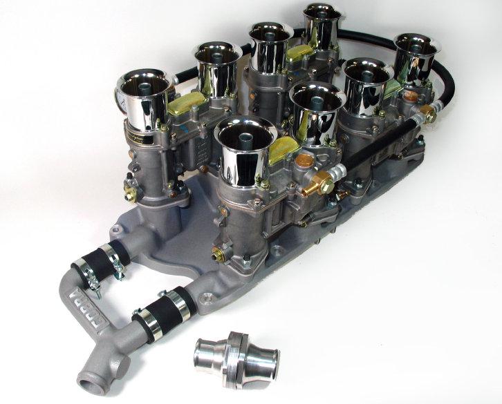Now I know that most of the recreations will run the fuel log / water-neck which has individual fuel lines running from the fuel log to each carb, but Pete Knight assured me that this will not work very well on a 400+hp engine and urged me to fit a direct feed fuel loop, so Jim’s cast water-neck without the fuel log will work perfectly well. here is an image of what it should look like when finished